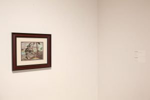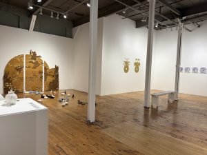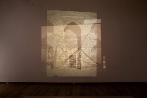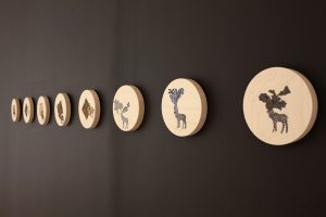 In the exhibition at the Tom Thomson Art Gallery, Esfahani is responding to the question “where are you from?”, that many immigrants are often asked, by exploring Tom Thomson’s legacy as a national icon and other symbols traditionally associated with Canadian identity from a diasporic lens. Through various multimedia works that layer stereotypical Canadian references with Iranian cultural motifs, interventions with found objects, and multiple painted and 3D printed replicas of Thomson paintings and artefacts, Esfahani transforms the gallery into a physical third space that dissolves the boundaries between both Iranian and Canadian cultures. –curator: Shannon Bingeman