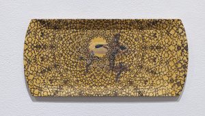 "Ducks", acrylic & laser-etching on collected object, 8x16 in, 2024, photo:Toni Hafkenscheid