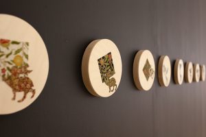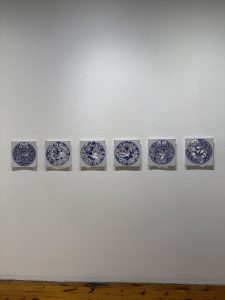 "Here & There: William Morris Patterns", fabric on wood panel, 6in diameter each, 2022, photo: Becky Comber