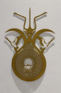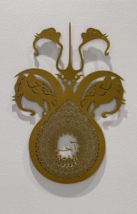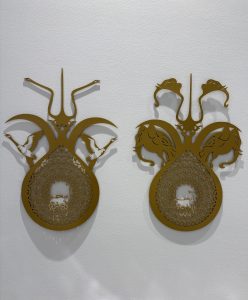 Right: "There: Elephant-Bird", laser-cut aluminum, approx. 24 in x 34 in, 2025