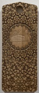 "Loonie", acrylic & laser-etching on collected wooden object, 6x15 in, 2025